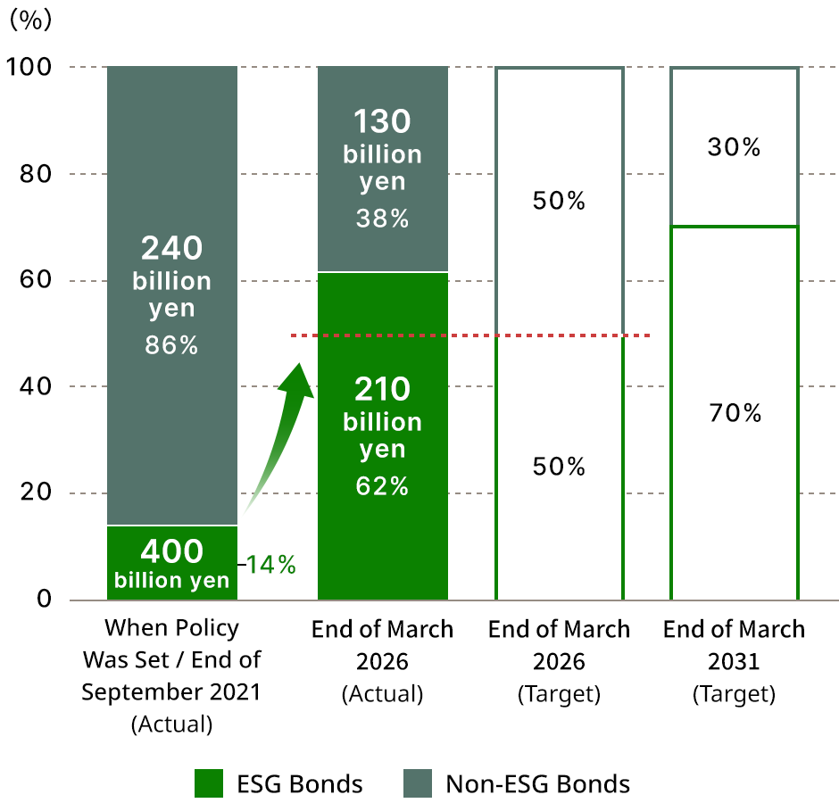 The Company aims to have ESG bonds account for 50% or more of the total corporate bond issuance volumes by the end of FY2025, and 70% or more by the end of FY2030.