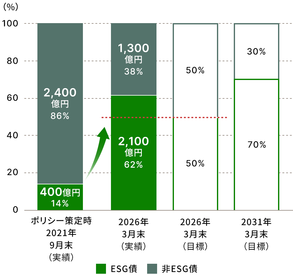 ESG債比率は2026年3月末に62%となり、2025年度末までに50%以上という目標を達成しました。